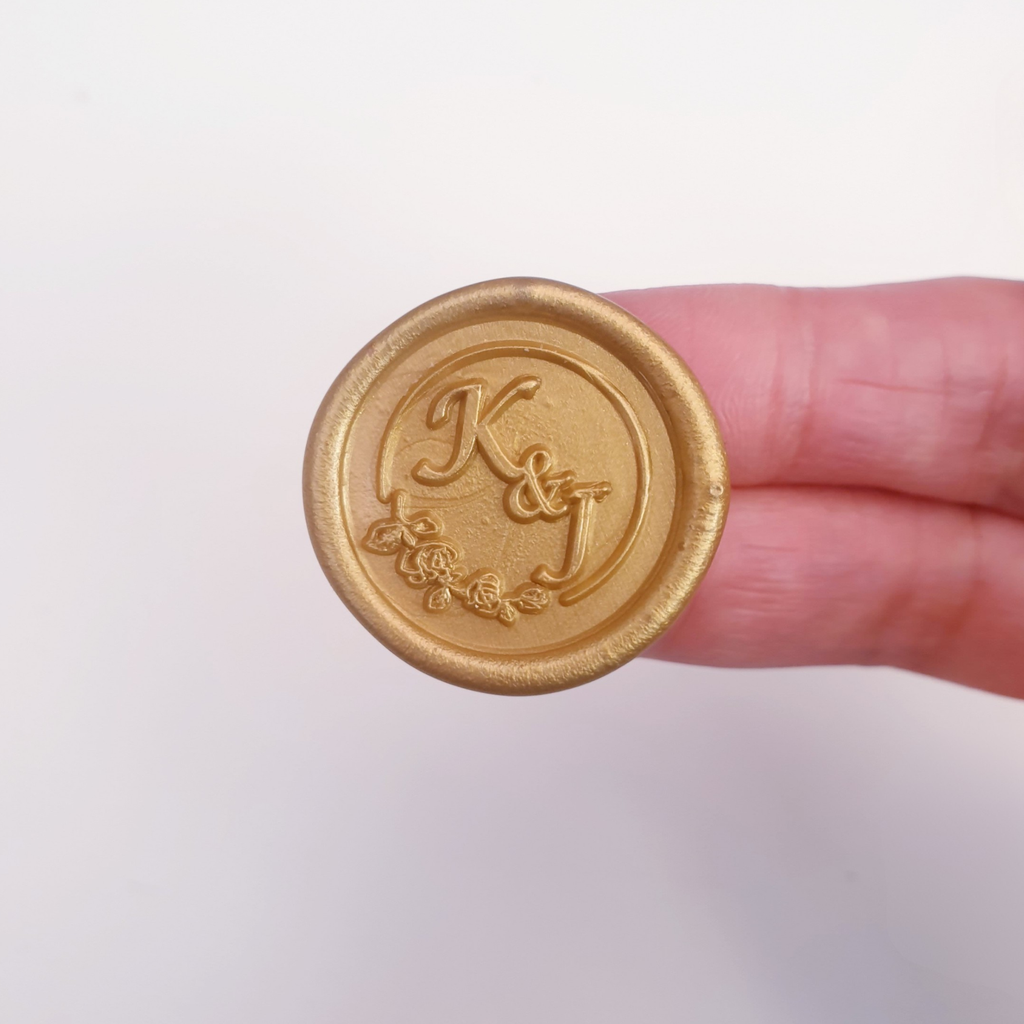 Custom Initial and date wax seal stamp for DIY wax seals. Design is engraved onto a 25mm brass stamp head. Please add personalisation at checkout in the notes to seller box. Add initials from left to right (e.g. J & K)