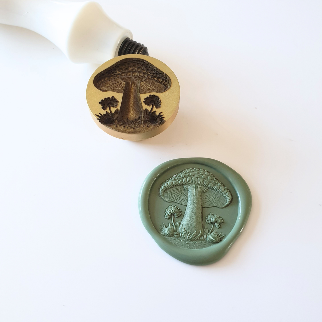 Detailed mushroom wax sealing stamp for DIY wax seals. Featured design is engraved on to a 25mm round brass stamp head with detailed impression.