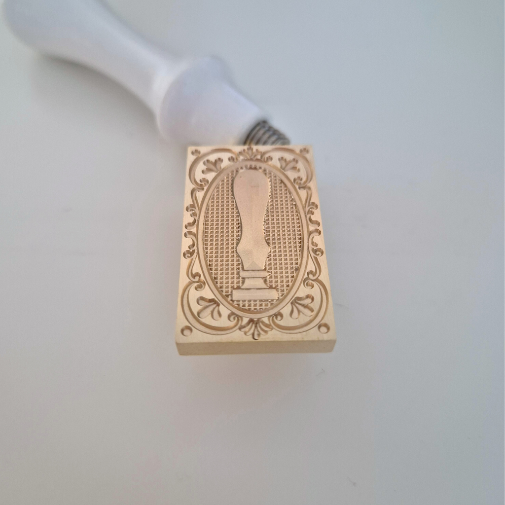 Oblong wax sealing stamp for DIY wax seals. Featured wax stamp design is engraved on to a large oblong brass stamp head with detailed impression.